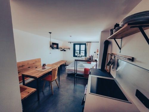 Es hat 2 Duschen/WC, 1 gemütliche Essküche mit großem Holztisch und Holzofen,